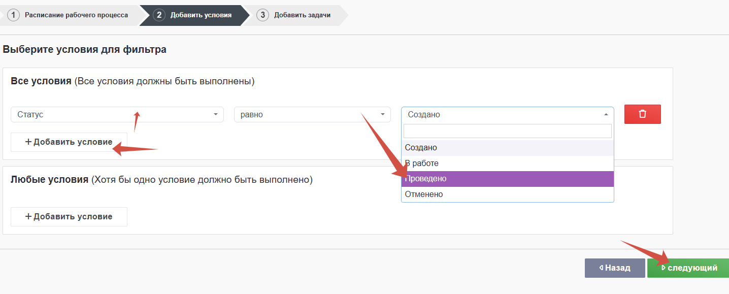 на втором шаге задать условие срабатывания процесса
