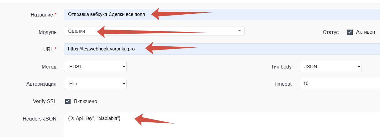 Настройка исходящего вебхук из Voronka.pro