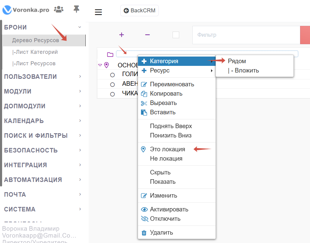 Создание локаций/филиалов и их залов/ресурсов делается в меню Дерево ресурсов через контекстное меню (Правая клавиша мыши). Для добавления локации кликаем на другую локацию и выбираем добавить Категория и Рядом. добавится "папка ресурсов" еще раз правой клавишей и выбираем "Это локация". это создаст в СРМ запись Локации и свяжет ее с данной группой ресурсов.