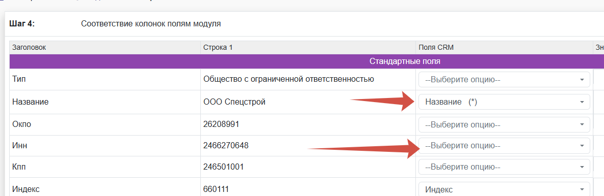 - Дальше нужно сопоставить поля из файла и из программы . если полей не хватает то тут отменяем идем в настройки полей добавляем нужные поля и снова возвращаемся к импорту