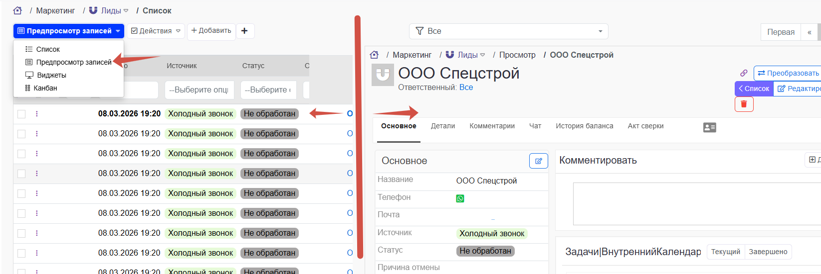 - Можно сделать представление чтобы слева был список лидов (например не отработанных) а справа было содержание лида тогда переключаться между ними не придется
