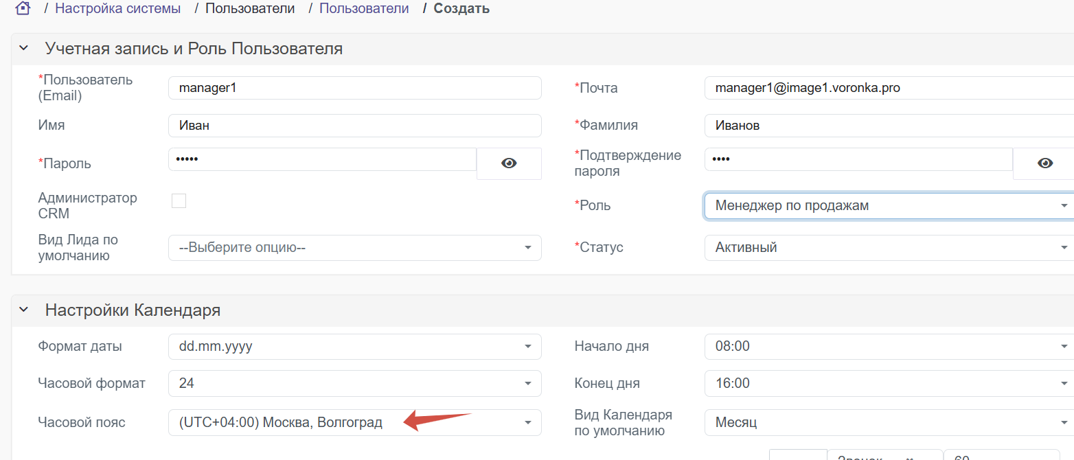обратите внимание на Часовой пояс и внутренний номер сотрудника (для телефонии)